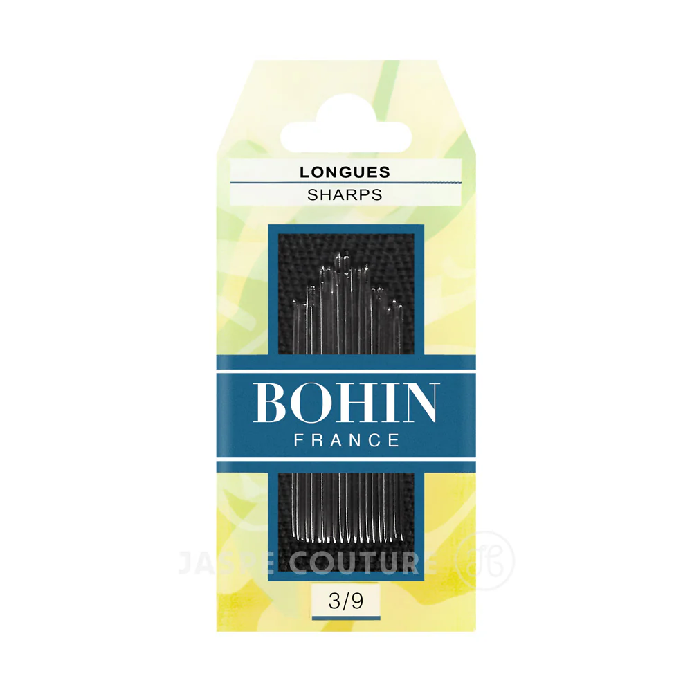 Aiguilles à coudre longues BOHIN 3-9 assorties en acier nickelé pour tissu léger et moyen.