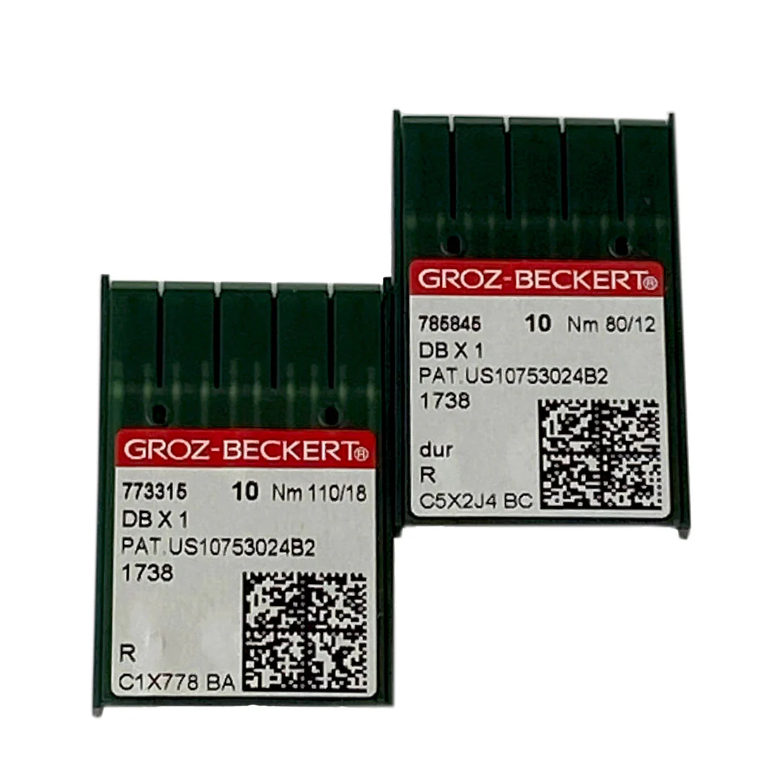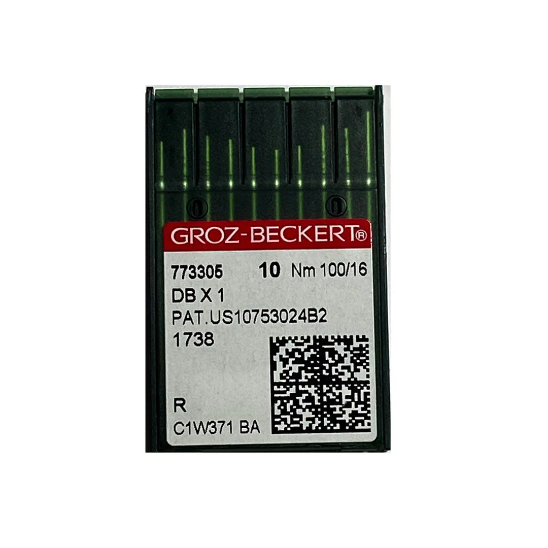 Plaquette de 10 aiguilles industrielles Groz-Beckert DB1, 1738, 16×257, NM 100. Qualité supérieure. Solides et durables, elles ne se cassent pas et sont compatibles aux grandes machines de marque.
