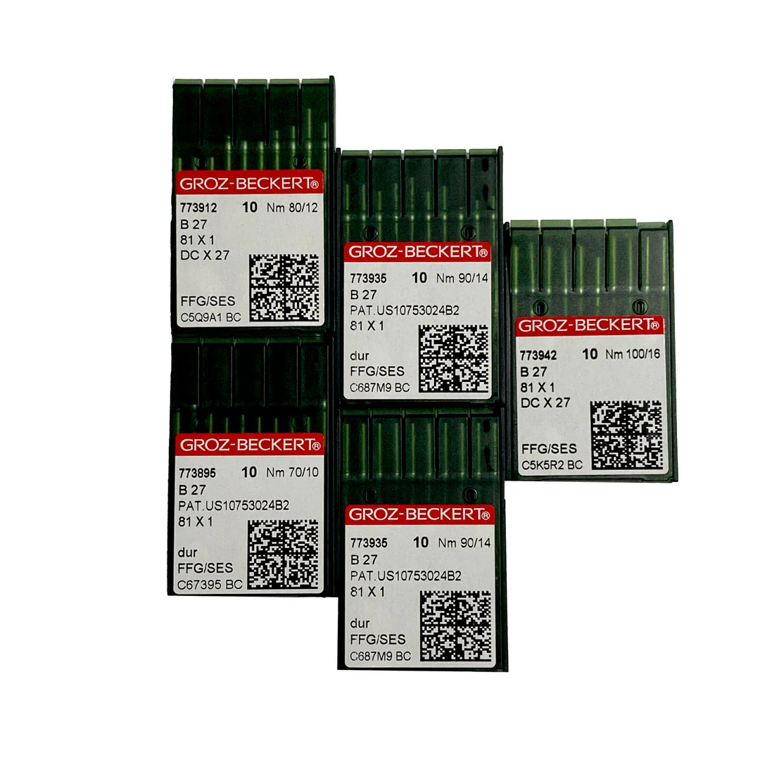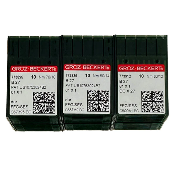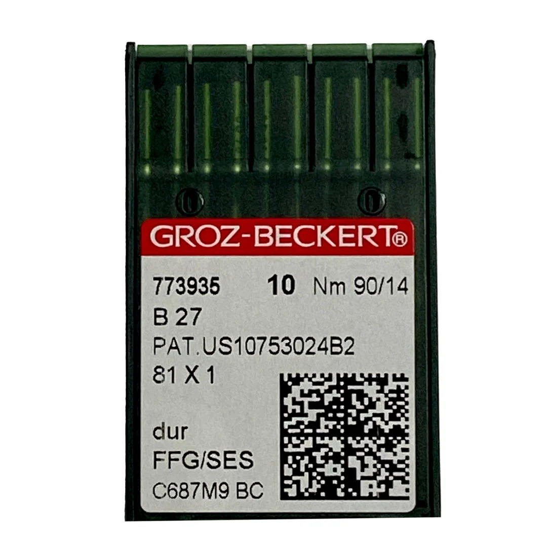 Plaquette de 10 aiguilles industrielles Groz-Beckert B27, 81×1 SES, DCx27J, NM 90. Qualité supérieure. Solides et durables, elles ne se cassent pas. Les aiguilles B27, FFG/SES sont des aiguilles droites avec deux longues rainures. Elles sont recommandées pour des articles fins en mailles ou des tissus tissés très fins.