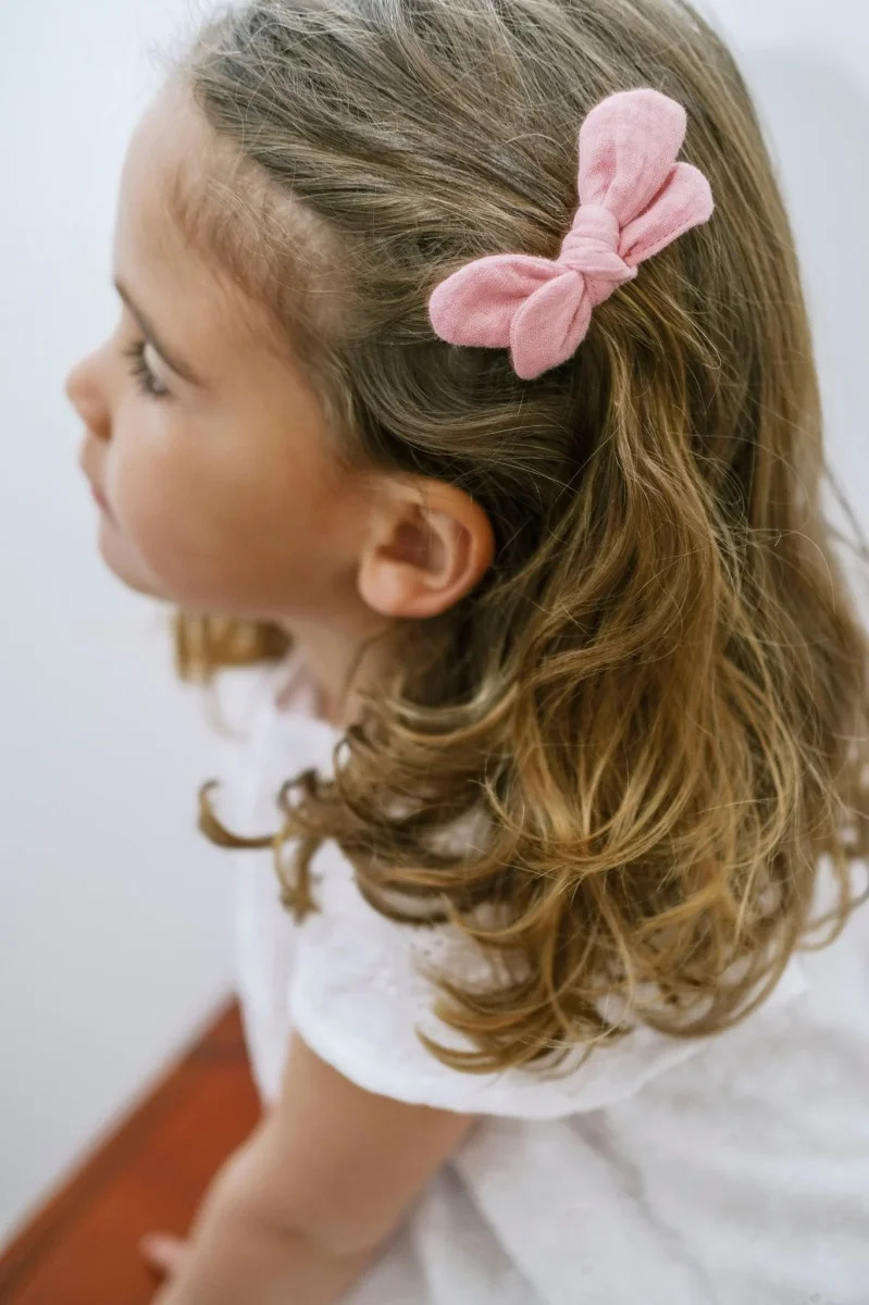 Ajoutez une touche de douceur et d’élégance aux coiffures de vos enfants avec nos barrettes à nœud en gaze de coton. Grâce à leur pince crocodile, elles sont faciles à fixer et tiennent parfaitement toute la journée, même sur les cheveux fins.