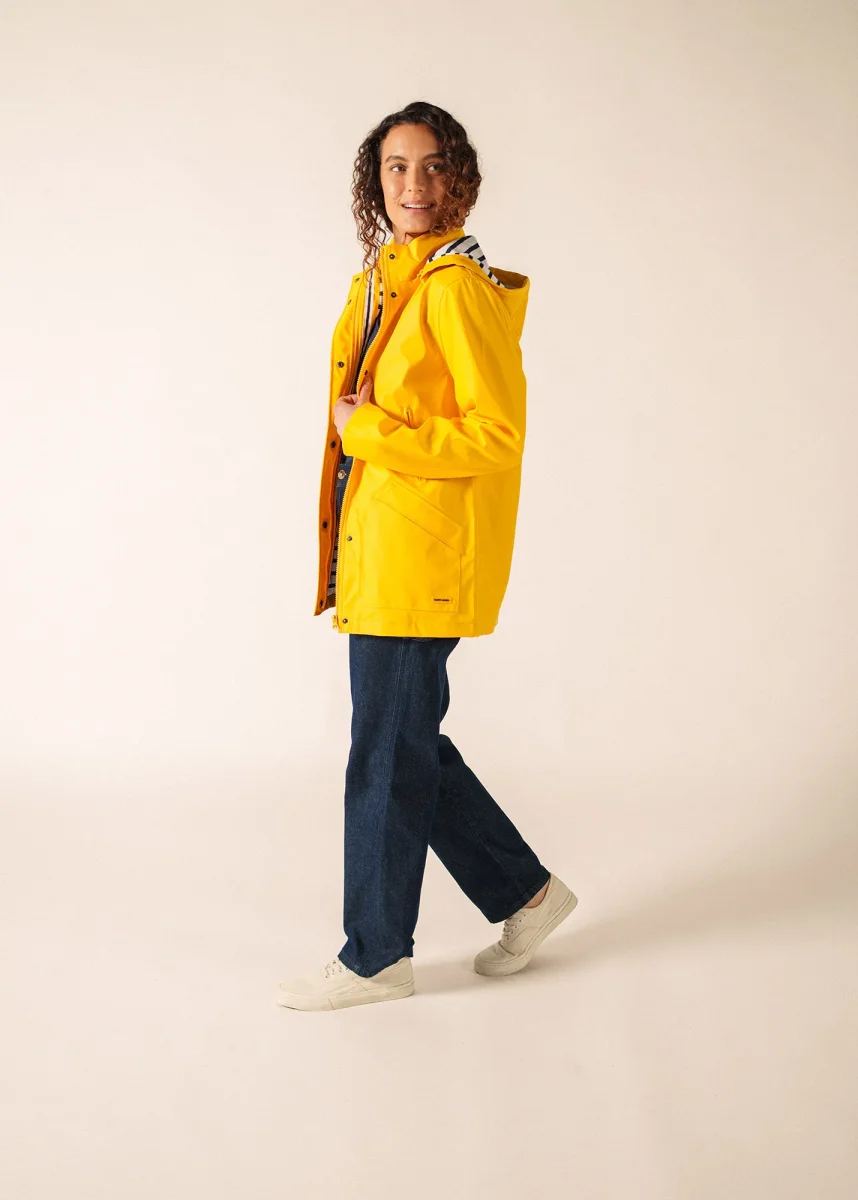 Le ciré waterproof Ste Morgane avec sa capuche amovible se distingue par sa doublure intérieure en jersey rayé et sa poche zippée intérieure. Son col montant vous permettra de profiter pleinement de vos balades en bord de mer. Un intemporel signé SAINT JAMES, indissociable du style marin.