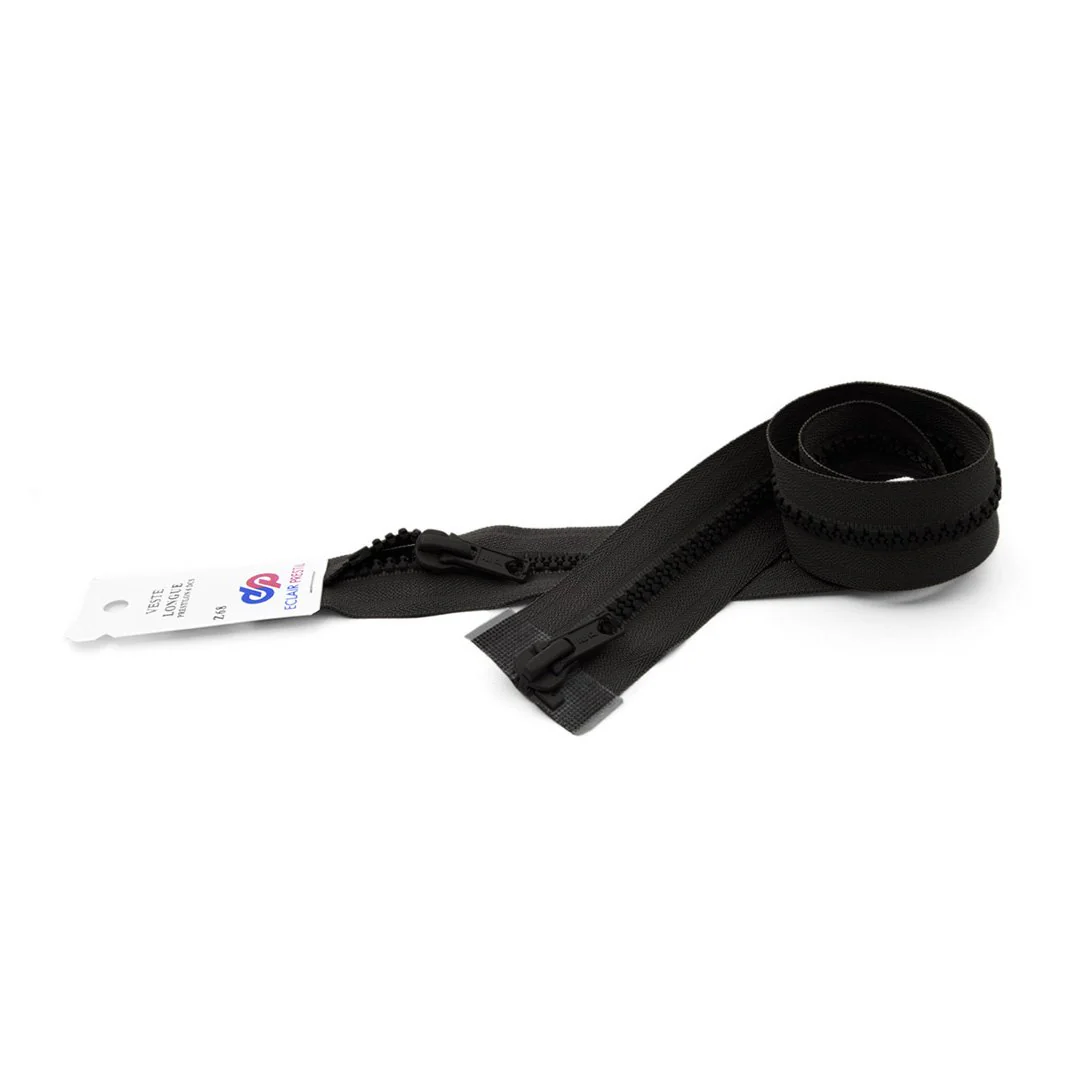 Fermeture Eclair séparable double curseur 6mm Maille moulée Z68. Elle est très pratique car elle permet une ouverture et une fermeture simultanées des deux côtés. Entièrement séparable, elle convient parfaitement aux vêtements de confection, aux sacs et aux projets de couture exigeants. Robuste et fiable, cette fermeture garantit un fonctionnement fluide et durable. Coloris noir intemporel, compatible avec tous les styles de création.