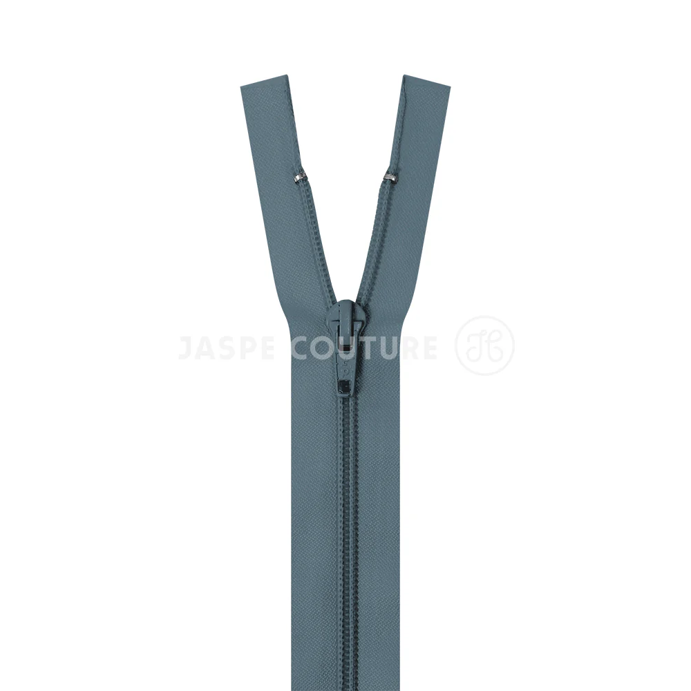 Fermeture éclair séparable nylon bleu gris – Maille nylon 6mm – Cette fermeture à glissière est très souple et très résistante. Longueur de 45 à 95cm. La tirette est assortie à la fermeture. Idéale pour vestes et blousons.