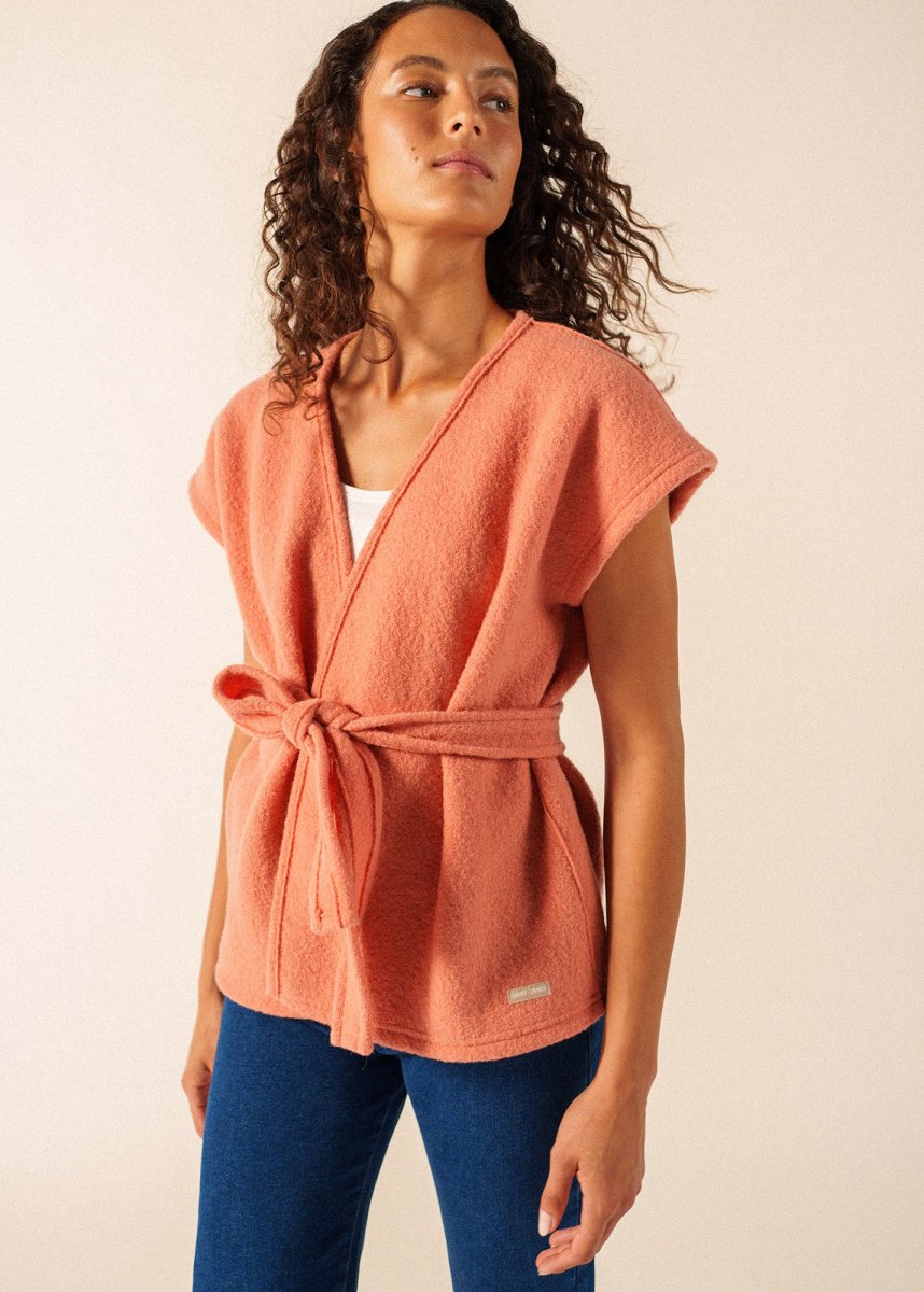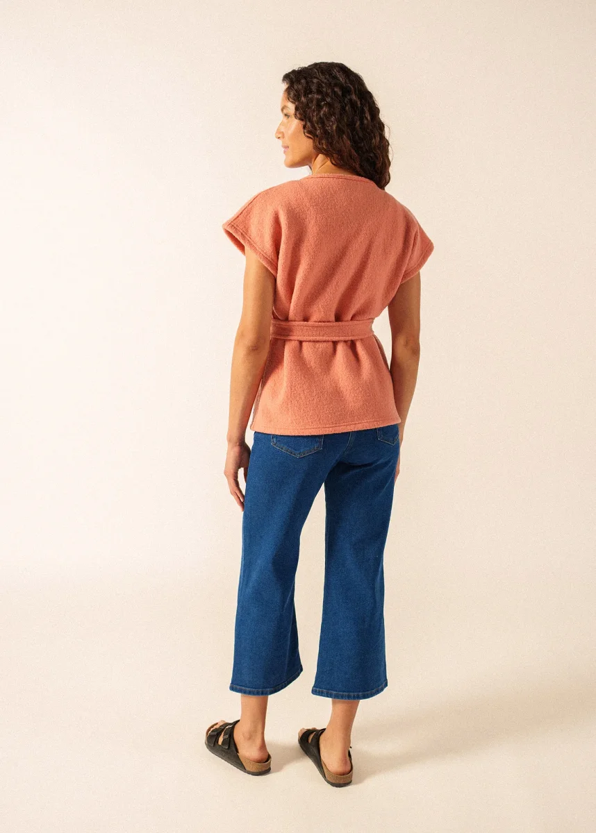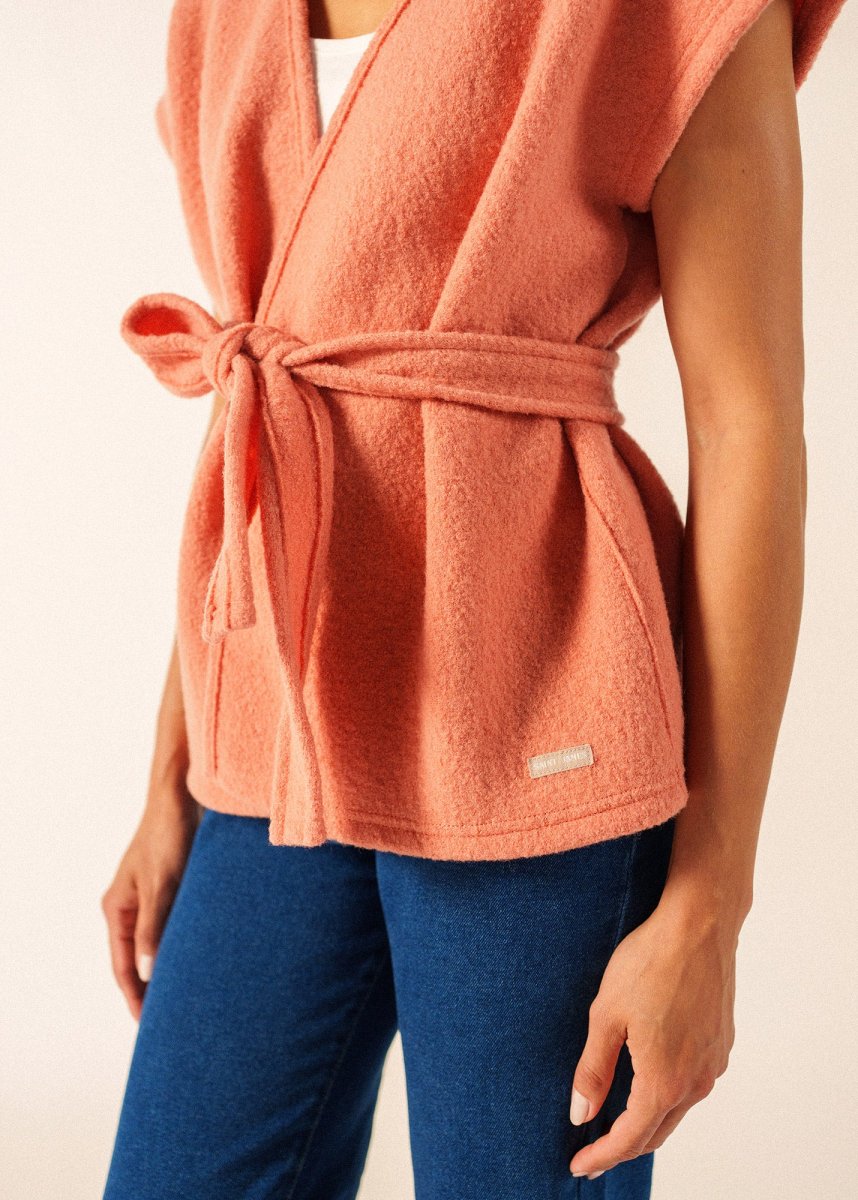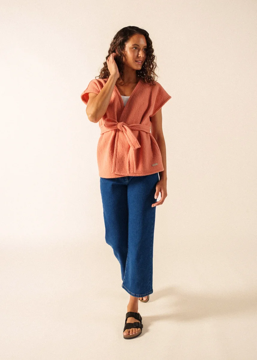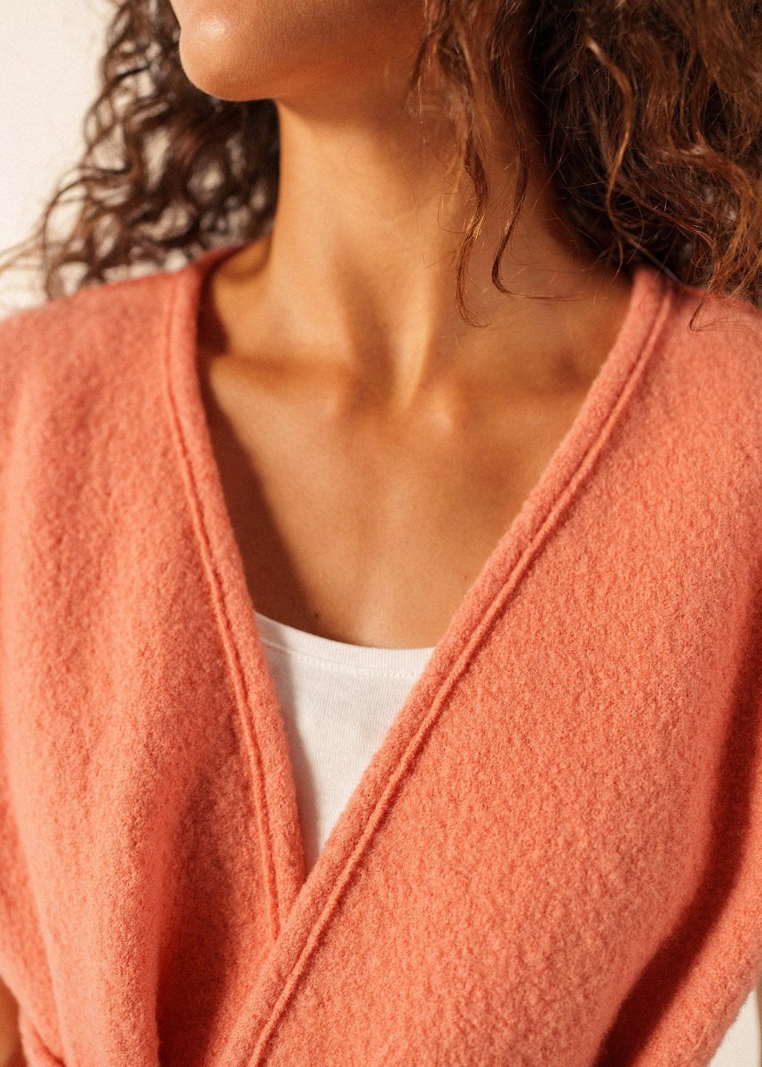 Les journées de printemps où le soleil joue à cache-cache avec les nuages sont celles où l’on apprécie une pièce comme le kimono Landemer. Confectionné en laine bouillie, il apporte la juste dose de chaleur sans être encombrant grâce à son design sans manches. Sa ceinture assortie vous permet de venir marquer la taille ou de le laisser ouvert pour une allure plus décontractée, selon le moment. Sa coupe droite a été pensée pour être facile à porter par-dessus une chemise ou un pull fin et pour apporter un bon confort. La laine 100% offre une respirabilité naturelle, et sa fabrication française dans nos ateliers en fait une pièce à la fois simple et de qualité pour l’entre-saison.