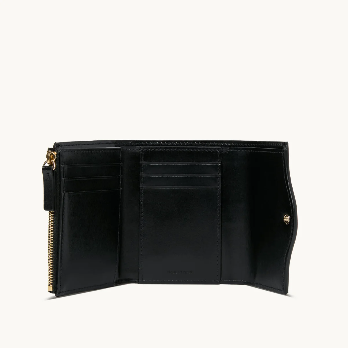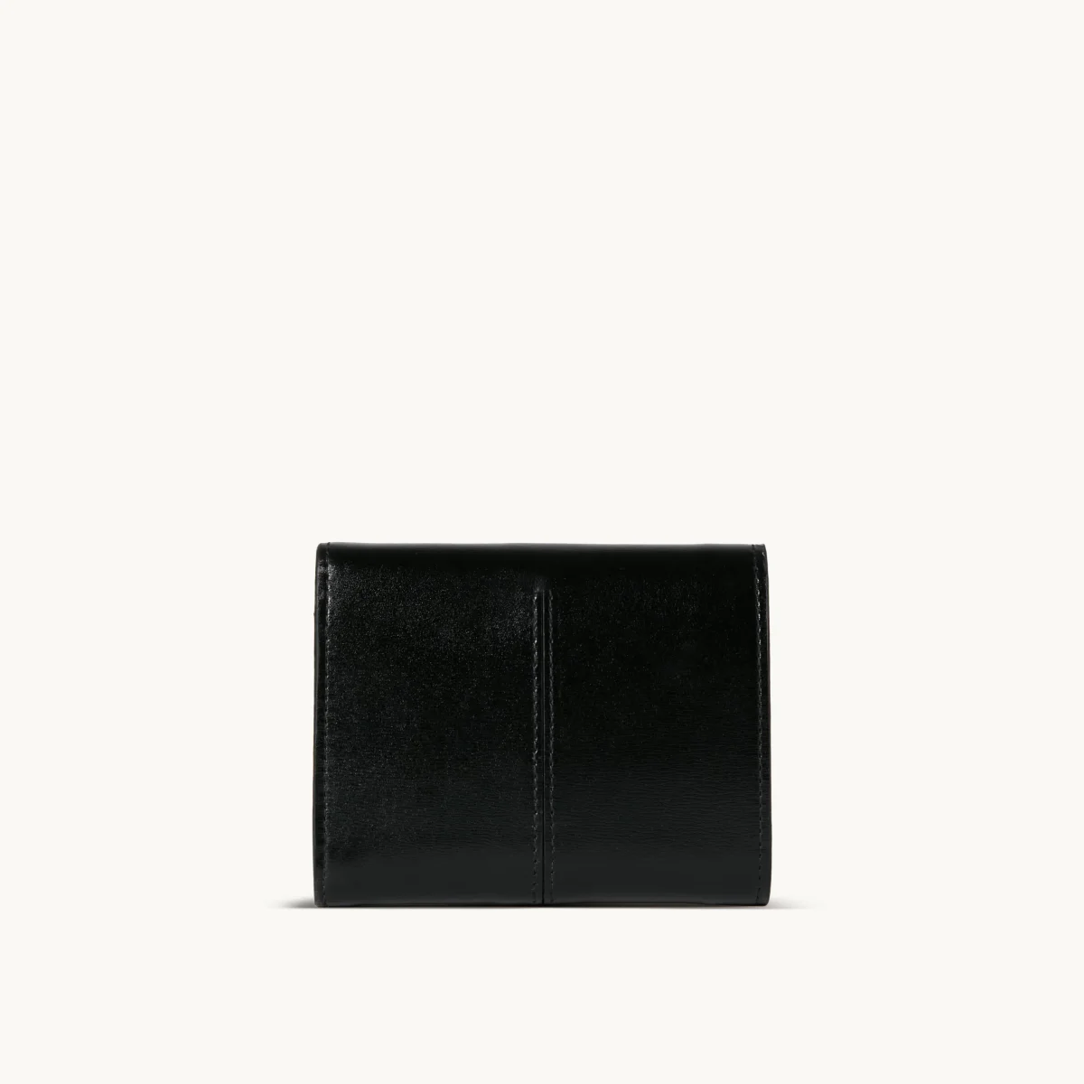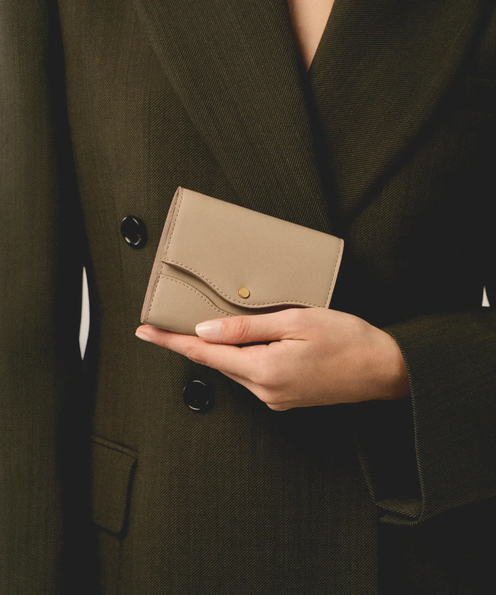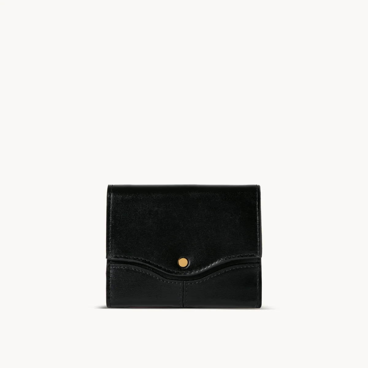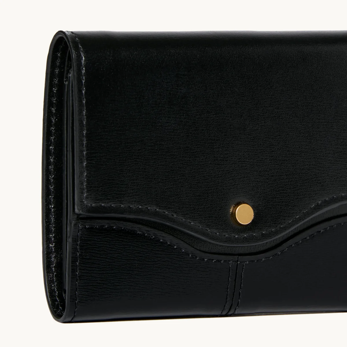 Portefeuille avec compartiments pour cartes et monnaie en cuir de veau issu de tannerie italienne certifiée LWG. Découpe graphique sur le rabat avec fermeture pression. Se glisse dans tous vos sacs. Emplacement pour carte d’identité française. Doublure en cuir. Logo gravure doré.