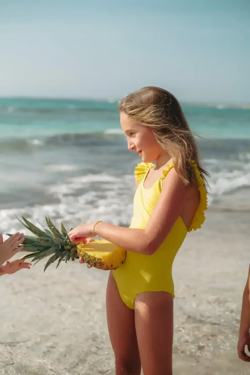 Direction Bora Bora avec notre maillot de bain une pièce pour fille. Incontournable best seller Lison Paris, ce maillot allie charme et confort. La jolie couleur jaune apportera un effet encore plus doux au look de votre fillette. Les bretelles en volant ajouteront quant à elles une touche d’élégance grâce à leur volume à la fois léger et généreux. Conçue à partir d’un tissu de qualité 100% italien, cette pièce offrira à votre fillette toute la douceur dont elle a besoin. La doublure a été élaborée de façon à assurer un confort optimal à votre fillette tout en apportant un rendu raffiné au maillot. Mieux encore, le label OEKO-TEX garantit l’utilisation de matières premières certifiées sans produits chimiques. Pour davantage de sécurité, nous avons opté pour des maillots avec un indice de protection solaire UPF50+ et parce que chez Lison Paris, au delà du confort que vous procureront nos produits nous pensons à l’environnement, nous avons choisi d’utiliser une matière éco-responsable Econyl® en fibres 100% recyclées au moment de la conception du modèle Bora Bora. Laissez votre enfant profiter des rayons de soleil tout en protégeant sa peau délicate… Adoptez le maillot une pièce Bora Bora ! Et pour assortir la tenue de votre fille à celle de ses sœurs, craquez pour notre maillot de bain une pièce Bora Bora pour ados ou bébés.