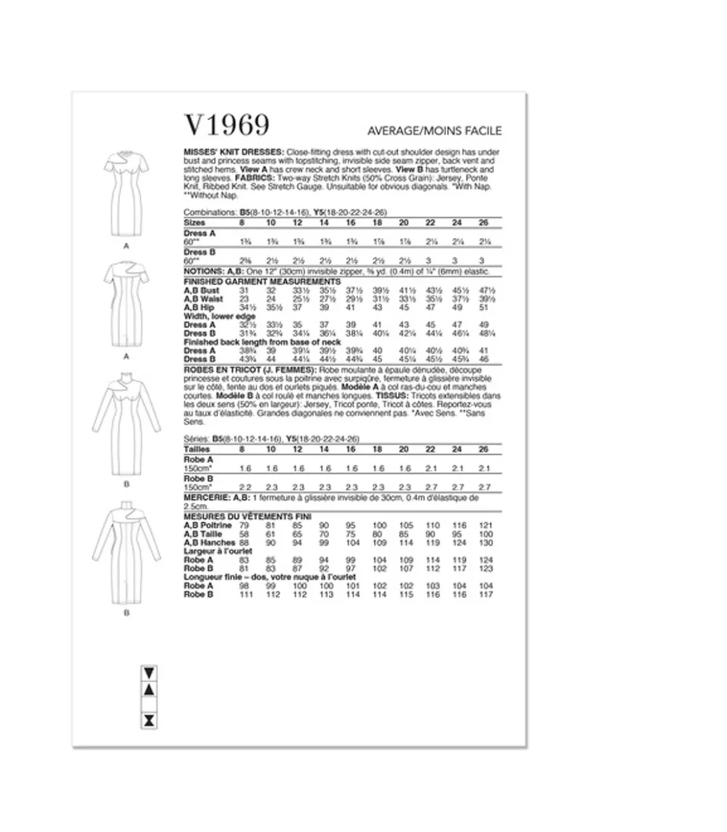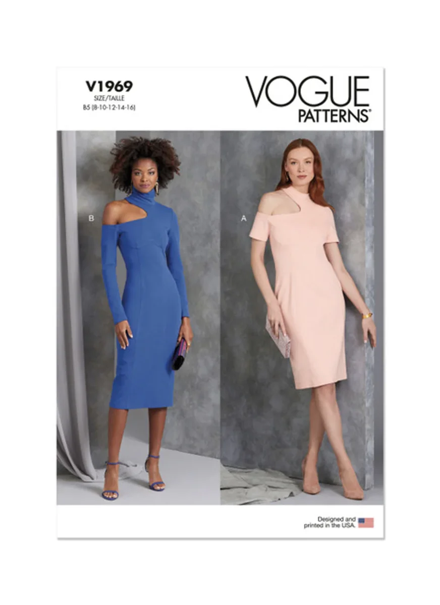 Patron robe Vogue 1969. Robe moulante à épaule dénudée, découpe princesse et coutures sur la poitrine avec surpiqûre. Fermeture à glissière invisible sur le côté