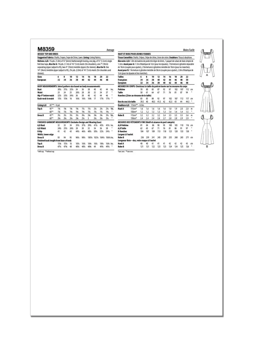 Patron de couture robe McCall’s 8359 – Flatteuse et coquette ! Haut et robe à corsage doublé, fermeture à attache sur la poitrine avec bonnets légèrement en forme et à détail de baleine sur le devant et le côté pour ajouter du support. Haut court avec fermeture à glissière sur les manches. Robe à manches bouffantes courtes, fendue sur le côté devant.