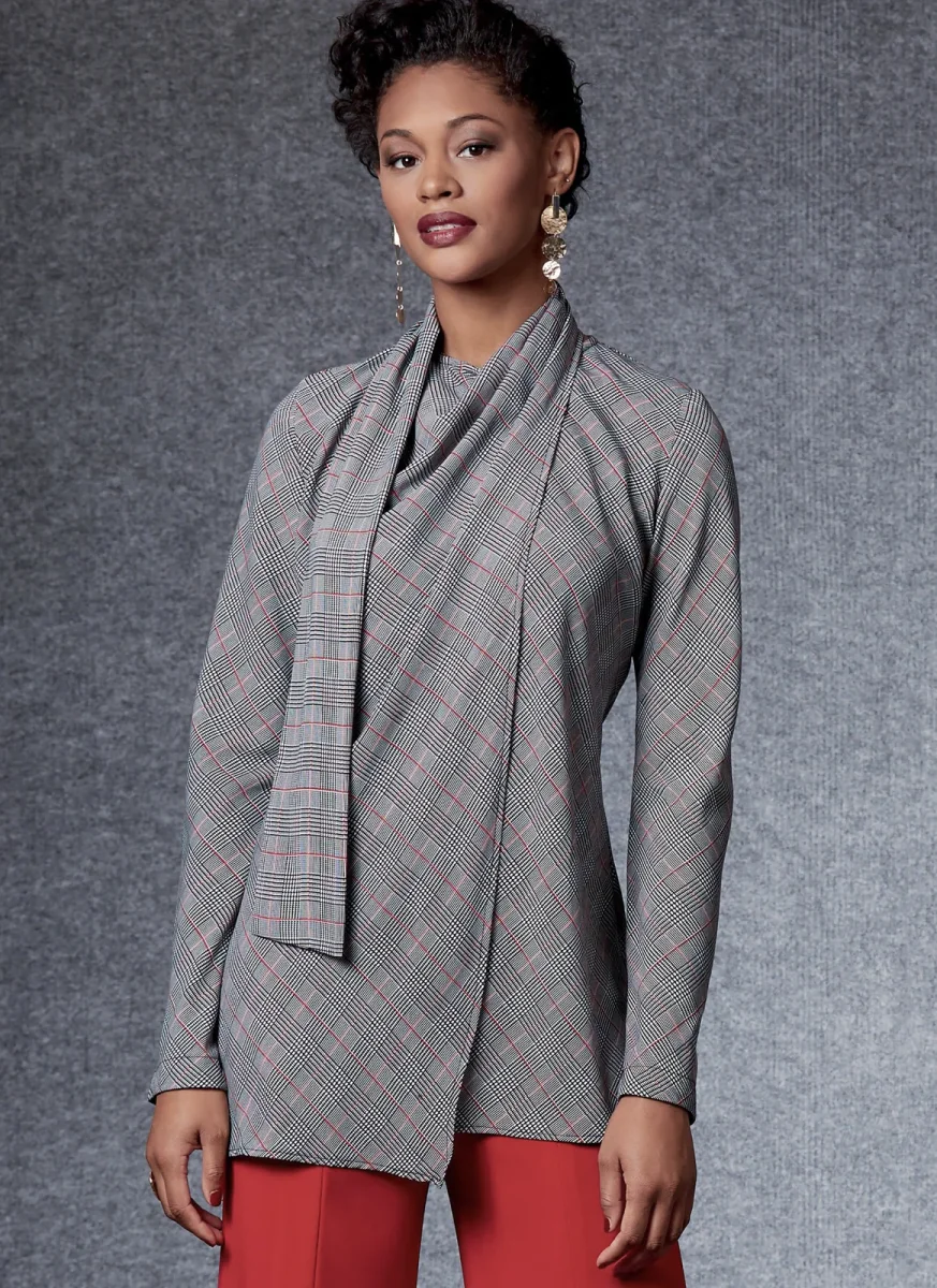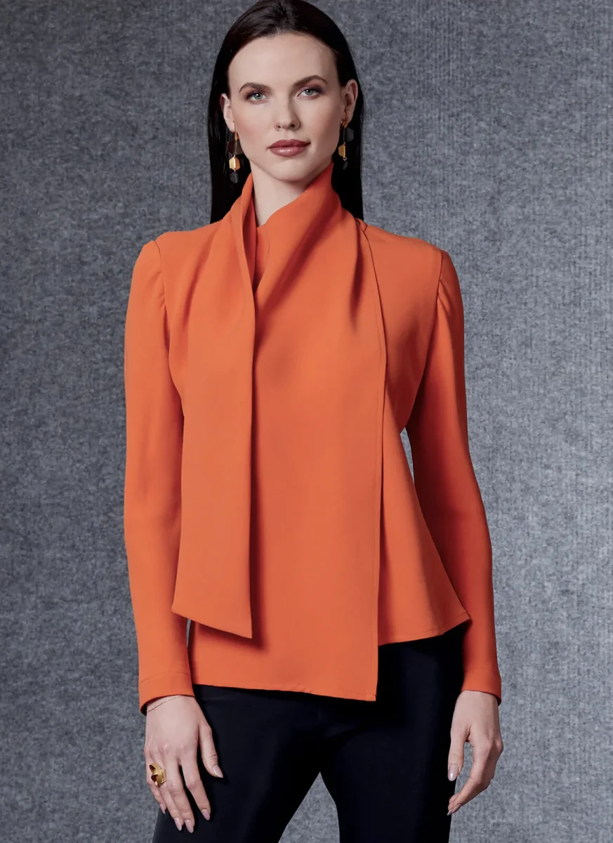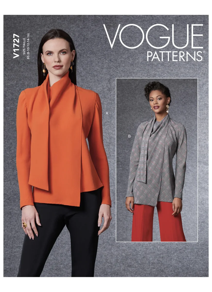 Patron couture chemisier, femme Vogue 1727. Très joli chemisier ajusté, coupé dans le biais à devant asymétrique formant un foulard, ourlets piqués, bouton-pression intérieur caché à l’encolure, épaules prolongées.