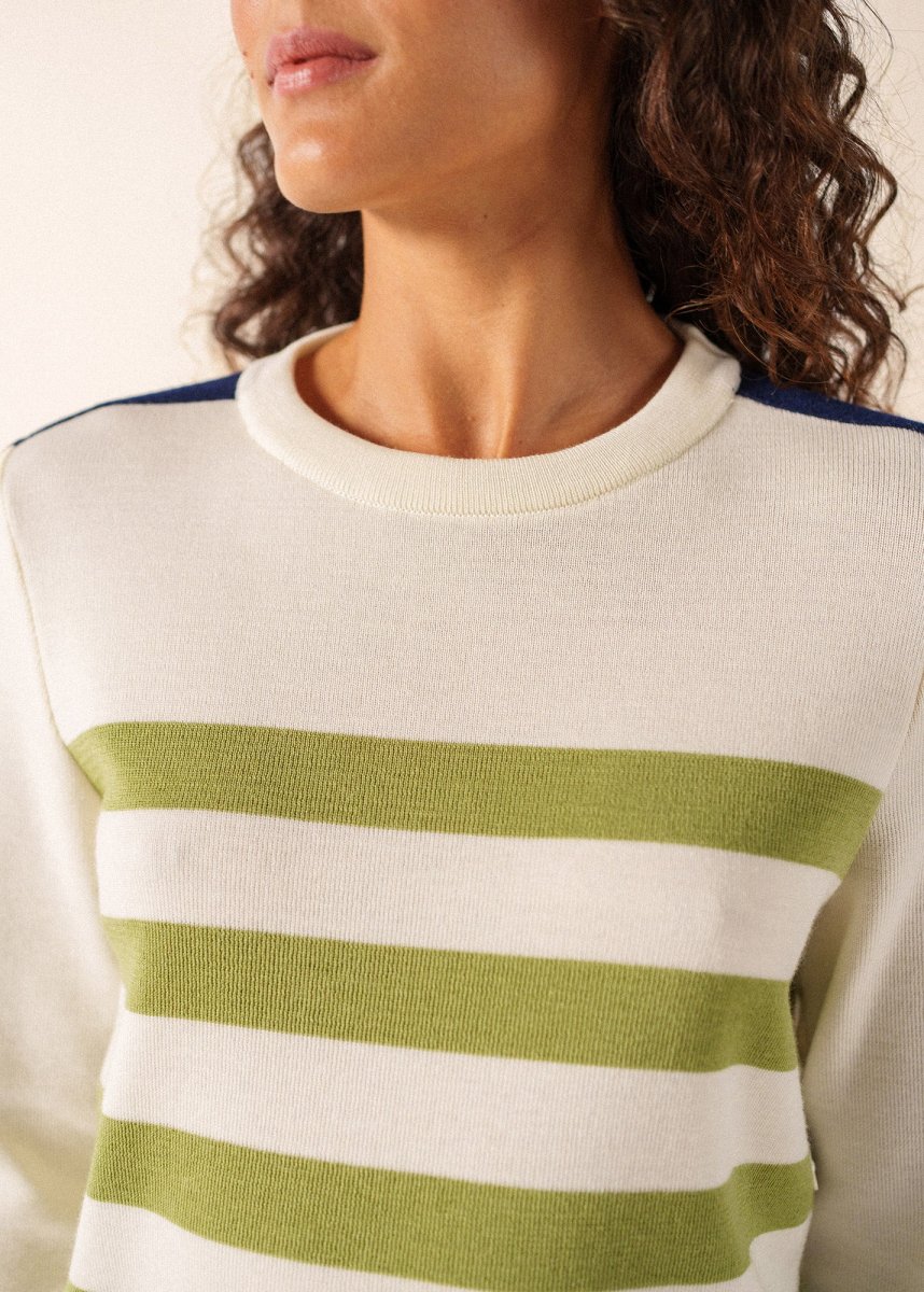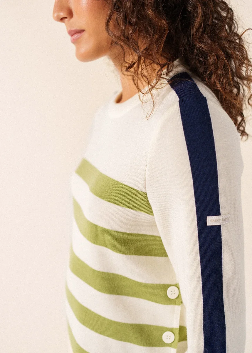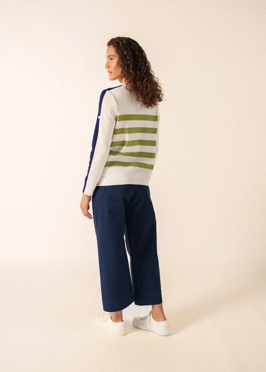 Inspiré par nos traditionnels pulls marins, le modèle Chausey joue avec leurs codes et les détourne avec poésie. Le tricotage 1×1 reste, mais le boutonnage épaule se déplace le long du corps, à gauche, et se pare d’une patte de boutonnage rayée.