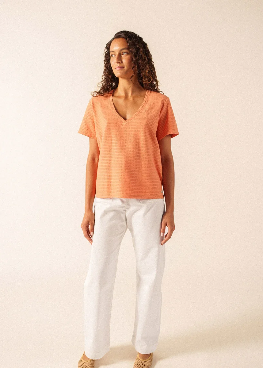 Il existe des pièces qui révèlent leur caractère au plus près. C’est toute l’idée du T-shirt Eline et de sa matière en jersey 100% coton, qui se distingue par un tissage jacquard. Ce dernier dessine une rayure ton sur ton qui joue avec la lumière et apporte une texture discrète à la surface du vêtement. Sa coupe est droite pour s’adapter facilement à vos tenues du quotidien, et son encolure en V est pensée pour dégager le port de tête.