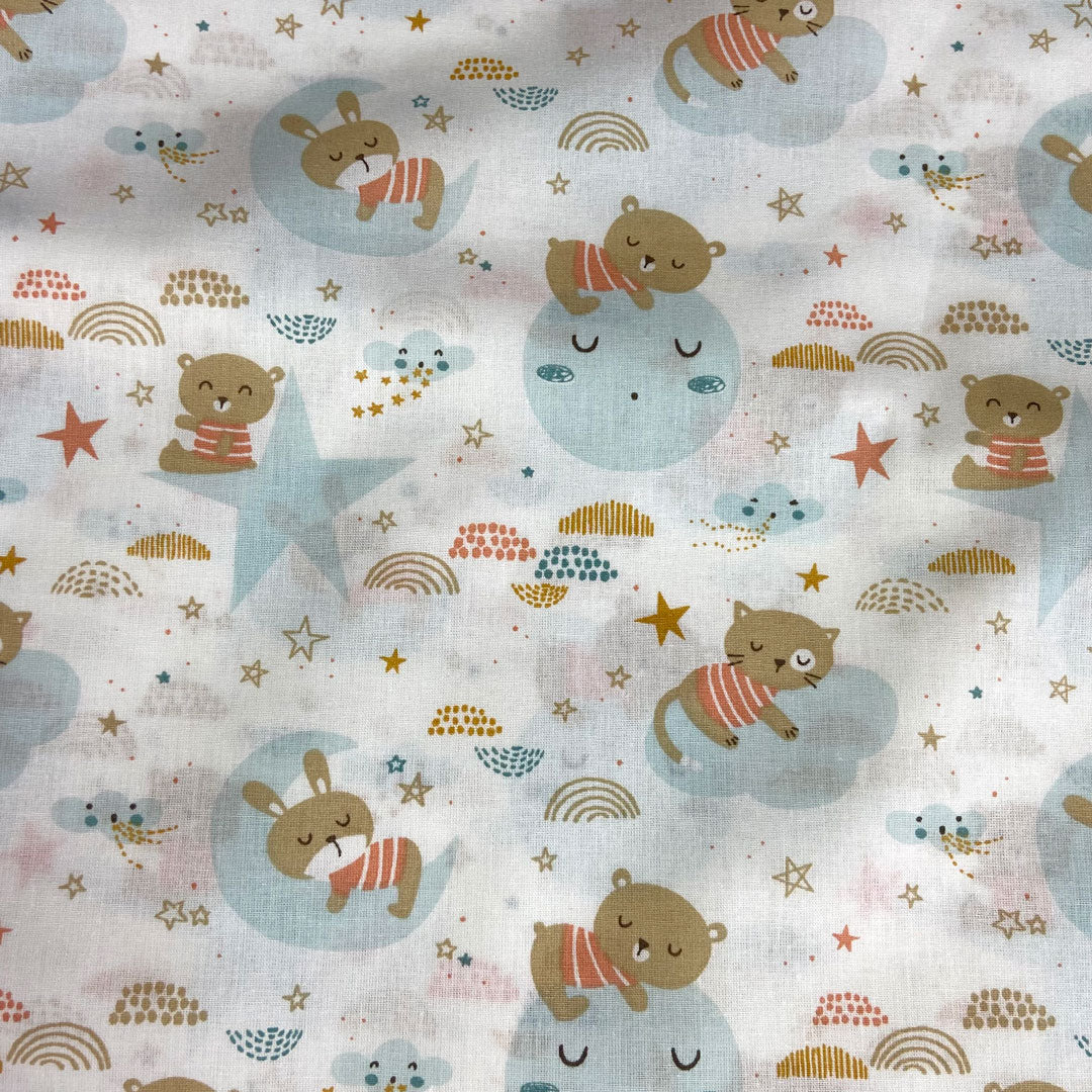 Tissu coton Amiki, motifs étoiles, lunes, nuages, oursons sur fond blanc