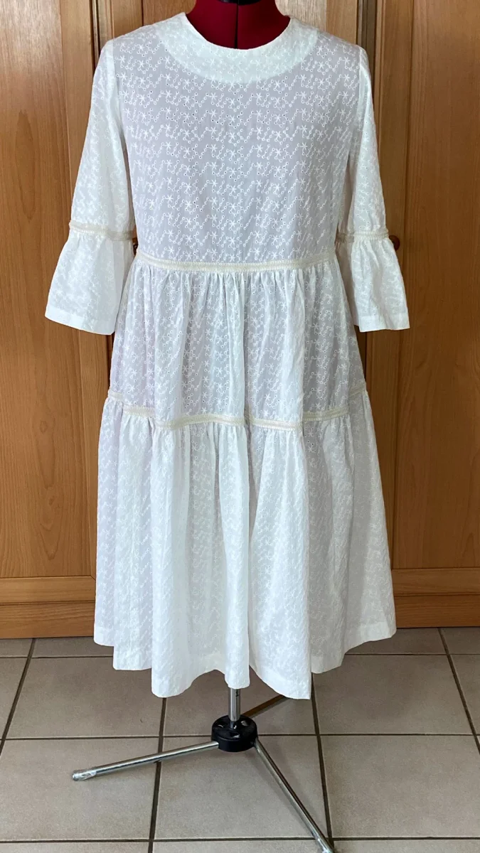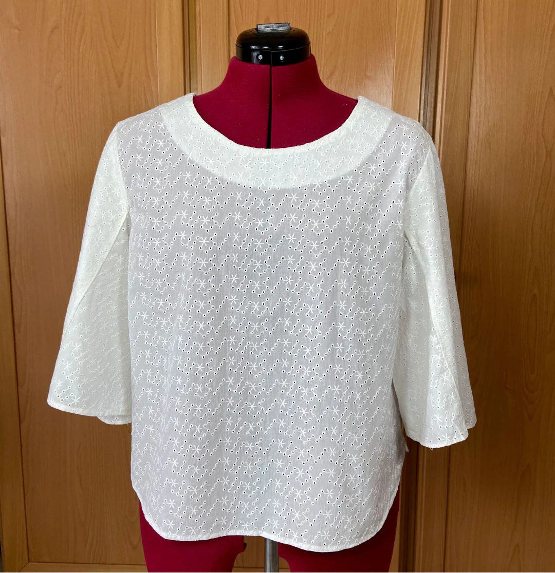 Tissu broderie anglaise très raffiné avec un tombé fluide légèrement alourdi par les broderies. Il a de la souplesse, de la légèreté et de la tenue. Très facile à coudre et à entretenir. Prévoir une doublure pour compenser sa transparence.