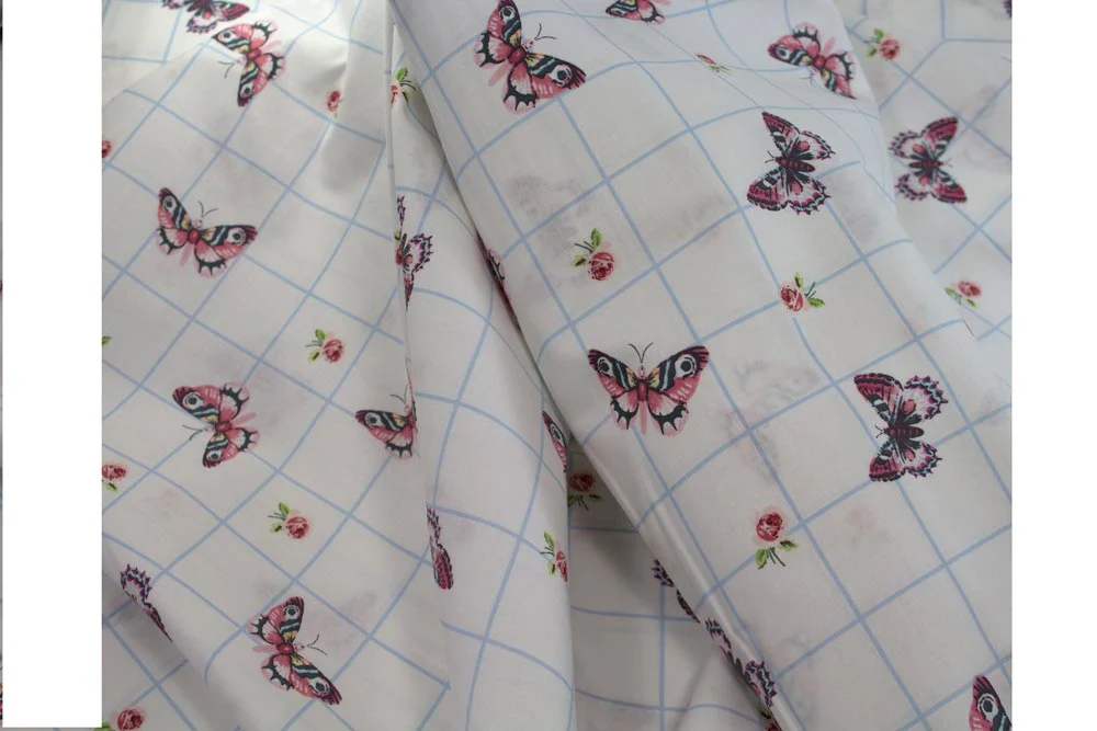 Couleur : fond blanc avec carré bleu et petites fleurs roses + papillons