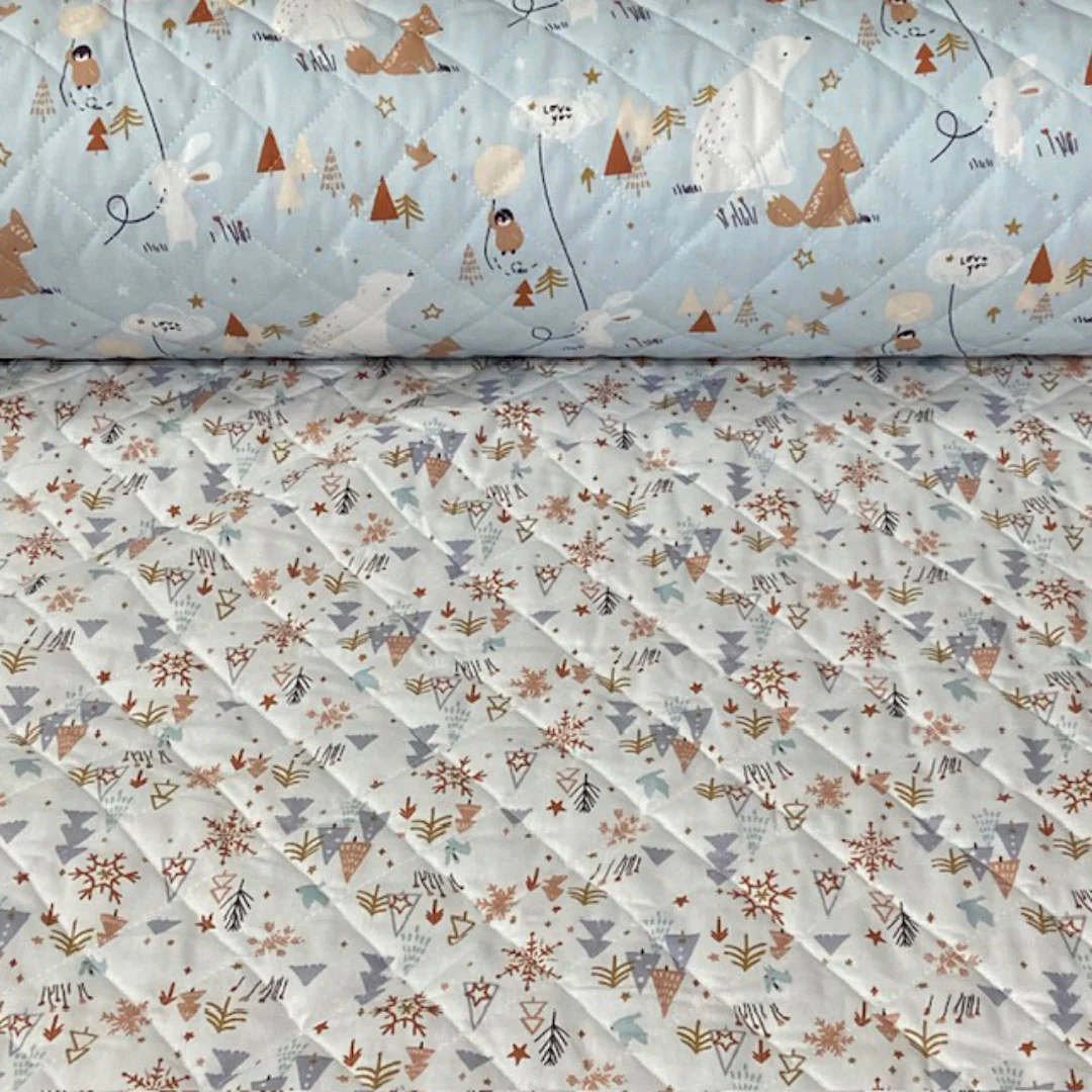 Tissu coton matelassé réversible pour enfants. Offrez confort et douceur à vos créations grâce à ce tissu en coton matelassé, parfait pour des projets à la fois pratiques et esthétiques. Ce tissu arbore d’adorables motifs d’animaux qui plairont aux petits comme aux grands : des animaux mignons comme des ours, des lapins sur fond bleu avec des étoiles et des sapins.