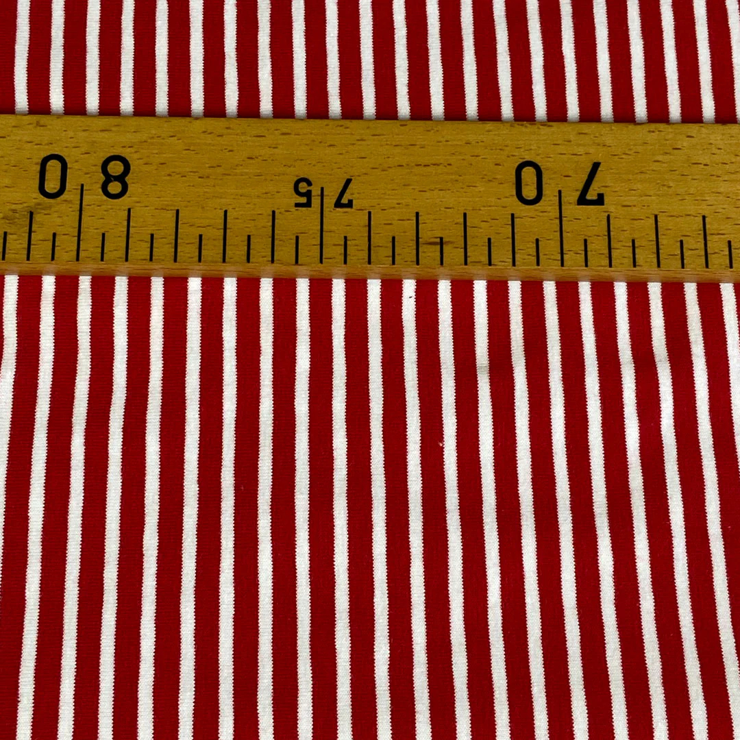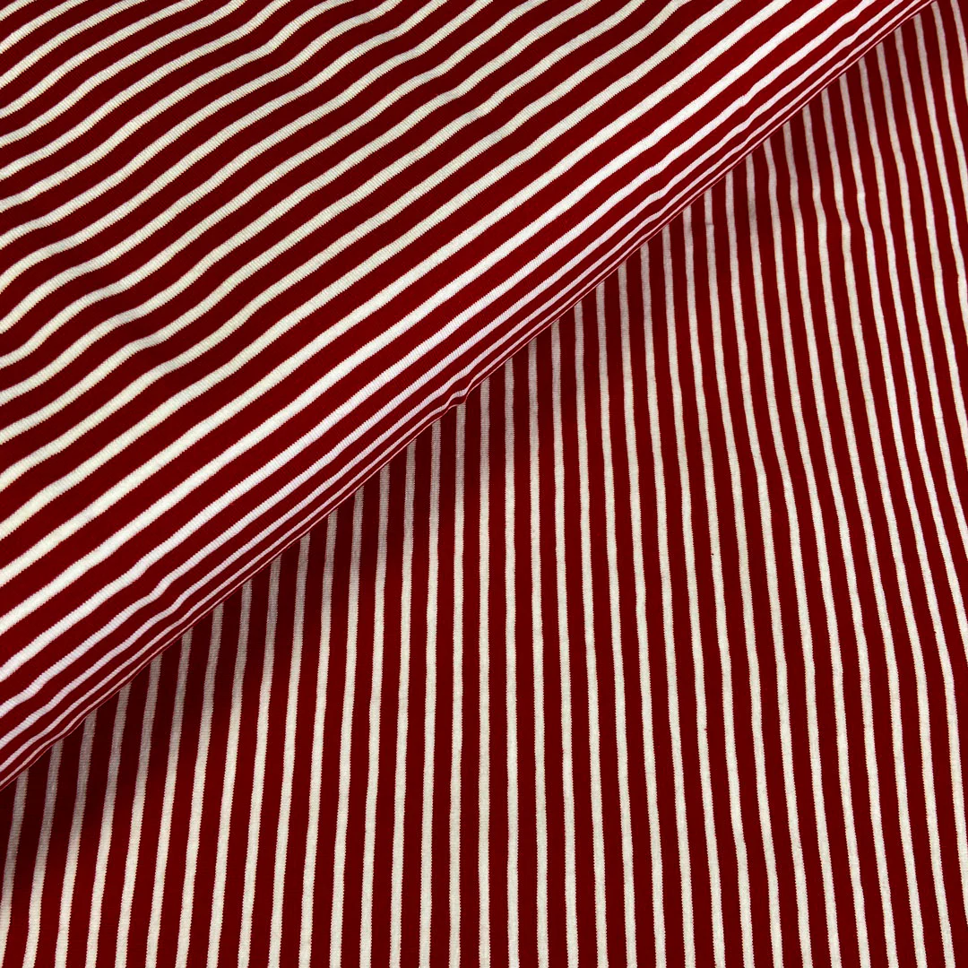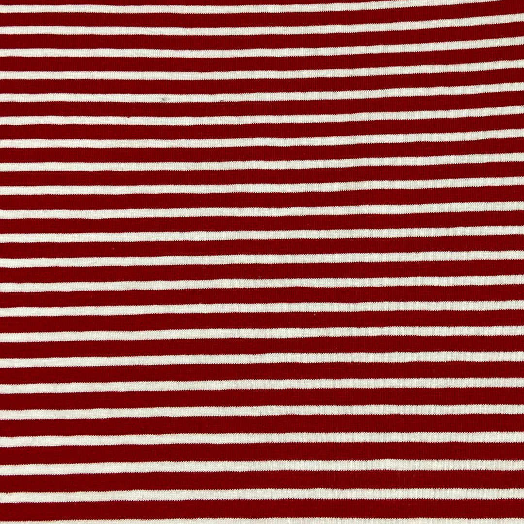 Tissu jersey rayures coton made in France certifié oeko-tex. Très joli tissu jersey à rayures pour confection de robes, T-shirts, tops jupes et pantalons pour enfants et adultes. Certifié Oeko-tex. Très agréable à porter. L’envers et l’endroit sont identiques. Les rayures rouges font 5mm de largeur et les rayures blanches font moins de 5mm de largeur.