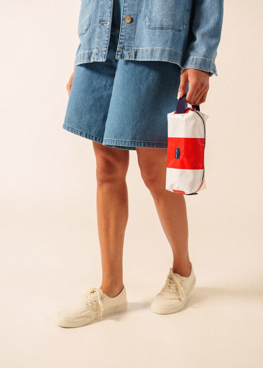 Conçue en France à partir de toiles de bâche et de parasol recyclées, elle donne une seconde vie à ces matières résistantes. Sa particularité est d’être réversible : vous pouvez choisir entre un côté à rayures bleu marine et un autre d’un rouge uni, pour l’assortir à votre humeur ou à votre sac. Une fermeture zippée garde vos effets en sécurité, que vous y rangiez vos clés, vos papiers ou votre maquillage.